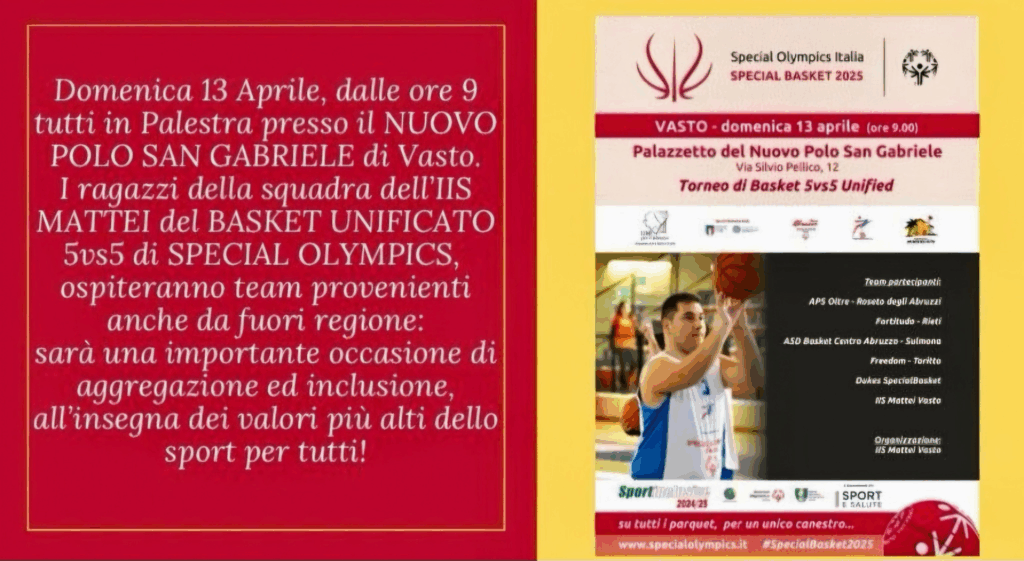 Domenica 13 aprile, il Palazzetto del Nuovo Polo San Gabriele di Vasto ha ospitato una tappa speciale e coinvolgente dello Special Olympics, torneo interregionale di Basket Unificato 5 vs 5, un’iniziativa che unisce sport e inclusione in un abbraccio di entusiasmo, partecipazione e condivisione.
